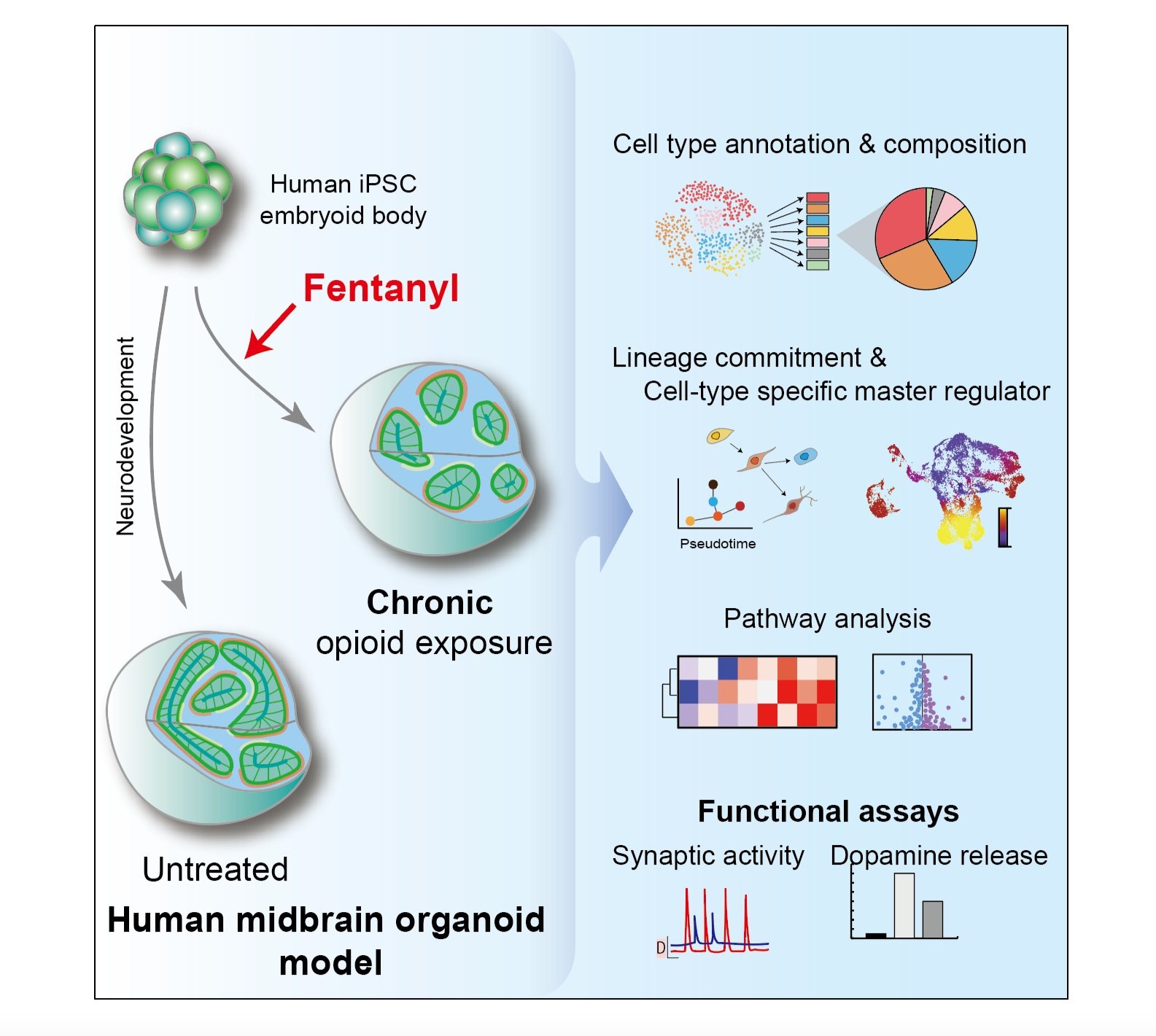 Understanding the impact of long-term opioid exposure on the embryonic brain is critical due to the surging number of pregnant mothers with opioid dependency. A human midbrain model is established that uses hiPSC-derived midbrain organoids to assess cell-type-specific responses to acute and chronic fentanyl treatment and fentanyl withdrawal. Single-cell mRNA sequencing reveals that chronic fentanyl treatment arrests neuronal subtype specification during early midbrain development and alters synaptic activity and neuron projection.
