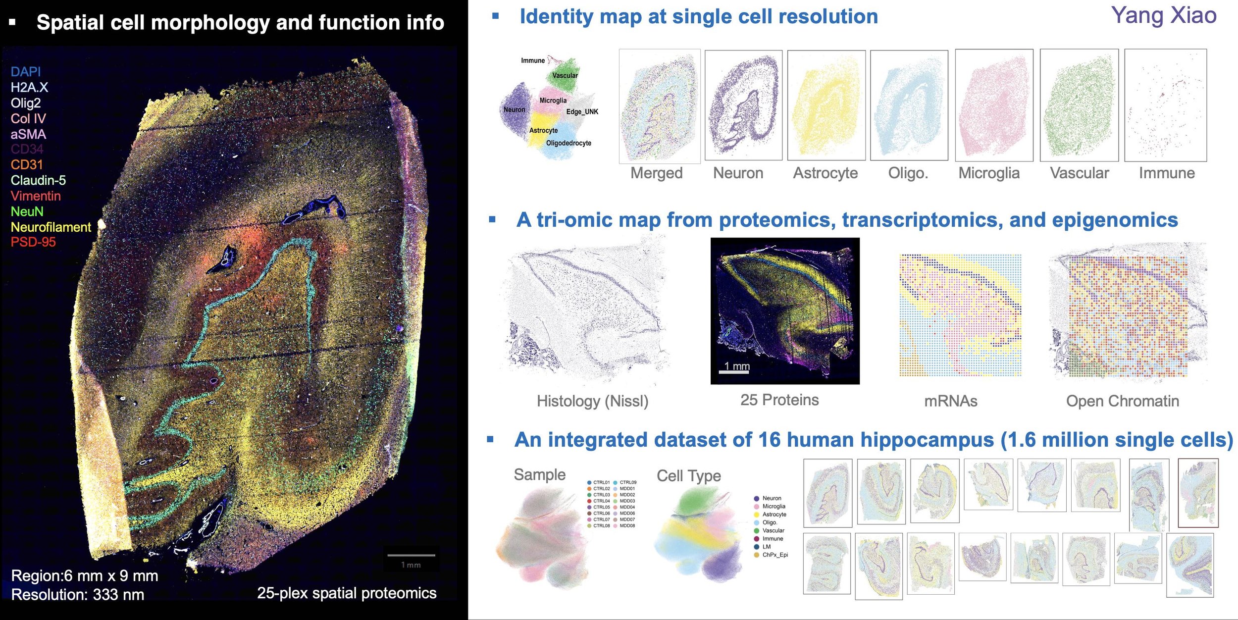 This is the first tri-omic taxonomy of the human hippocampus, addressing two critical challenges in spatial biology. First, the missing cell morphology and extracellular matrix information were profiled by 25-plex sequential protein imaging (known as CODEX). This innovation also allowed us to create spatial maps of cell identity with single-cell resolution. Second, employing our in-house spatial mRNA and ATAC-seq platforms (DBiT-seq), we identified the RNA dynamics in different hippocampal subfields and open chromatin regions for gene regulation. Together, these efforts produced the most comprehensive spatial atlases of 16 human hippocampi, comprising over 1.6 million single cells. (Unpublished)