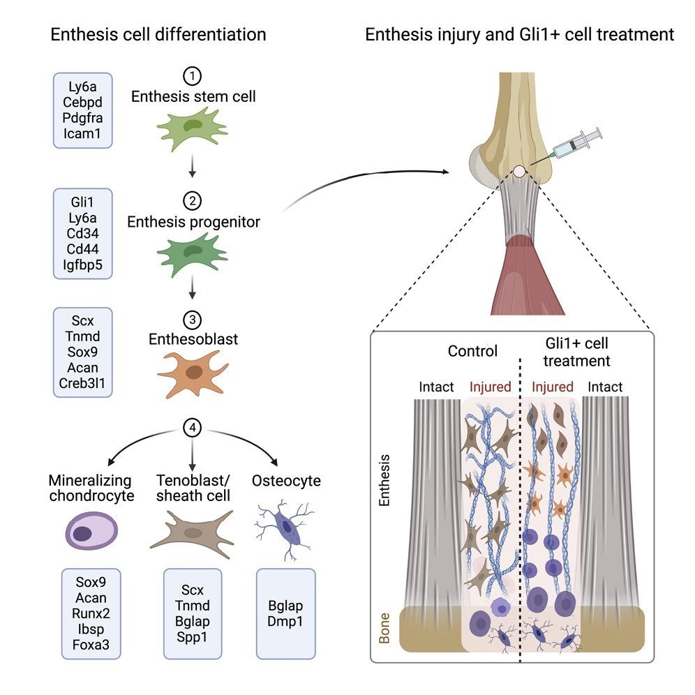 This study reveals the cellular landscape in the tendon enthesis, the tissue interface where tendons attach to bones. We established a framework for understanding enthesis maturation and identified a potent Gli1-lineage progenitor with clonogenicity and multipotency that improves enthesis healing in an adult injury model.